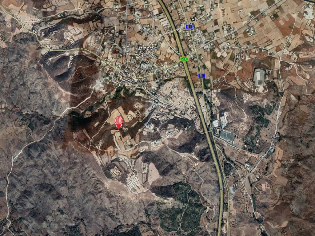 The property for sale is a residential field in Alambra Community in Nicosia District. It is located 940 meters (approx.) east of the Nicosia - Limassol highway and 740 meters (approx.) south of the village center.It has an irregular shape and a slightly sloping surface. The property is inaccessible via registered road but is located at a distance of 175 meters (approx.) northwest the nearest public road.
