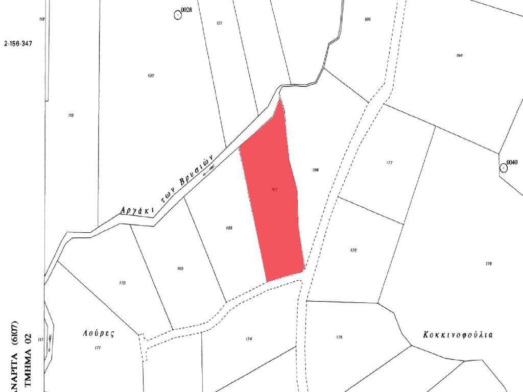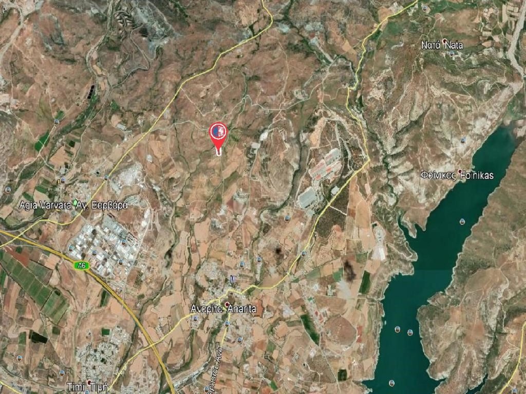 Agricultural field in a Consolidation Area in Anarita community in Paphos District.It islocated at a distance approximately 3 Km northeast of the centerof the community and approximately 1,2Km northwest of the Asprokremmos dam.The field has an irregularshape with a slightly sloping surface. It abuts onto a public road along its eastern boundary with a frontage of approximately 45 meters.