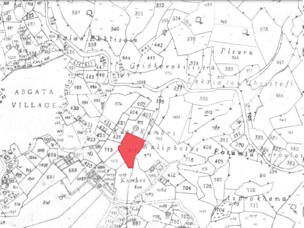 Residential field within the administrative boundaries of Asgata village in Limassol District. It is situated in the eastern part of the village in the location of Kambos. It has an irregular shape, a sloping surface and no access.