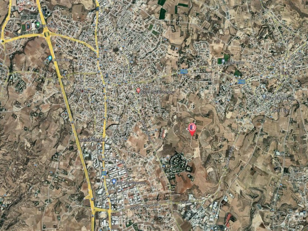 Residential field in an attractive locationin Geri Municipality in Nicosia District. It is located at a distance of 1.1 kilometers (approx.) south of the Geri Avenue, and 1.3 kilometers (approx.) southwest of the Elias Poullos football stadium.It is situated in a quiet and beautiful area that is characterized by scattered residential developments and is very close to amenities such as schools, supermarkets and related services.The property has an irregular shape and an uneven surface. The property is considered landlocked, however it is situated only a short distance from the closest public registered road.