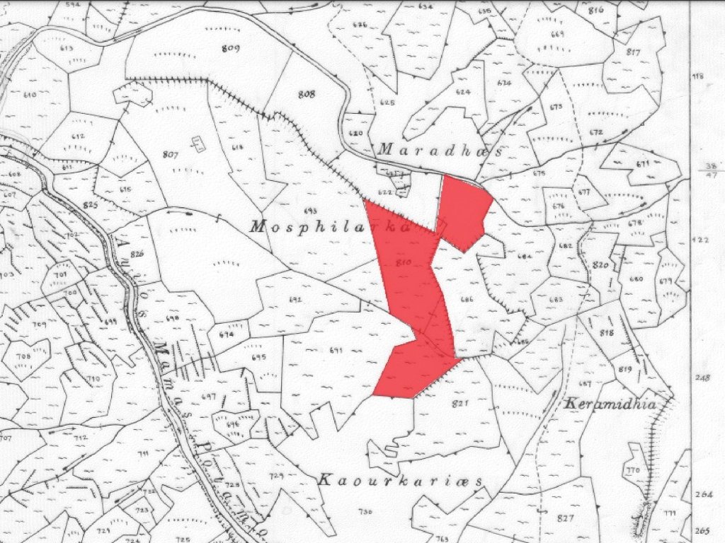 Field in Gourri Community of Nicosia District. It is situated at a distance approximately 1.7 km south of the Community center and approximately 1 km east of Farmaka - Gourri road connection.It has an irregular shape with a slopy surface and it is landlocked. The property is located approximate 460 meters southeast of the nearest under-registration road.The locality of the property is characterized by a beautiful natural environment and it falls within the Protection Zone Z1, having building density coefficient 6% .