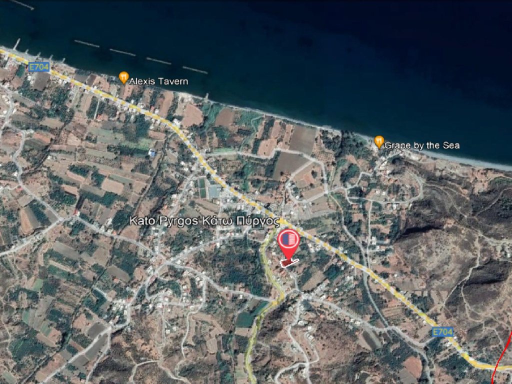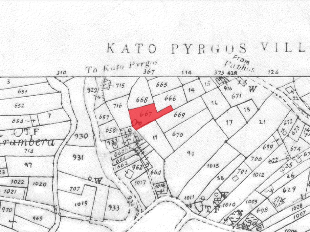 The property for sale is a residential field which lies within the administrative boundaries of Kato Pyrgos village, in Nicosia District, at a distance of approximately 225m south from Agioi Konstantinou and Elenis, and from the village center.It has an irregular shape and a slight sloping surface and access to the property can be gained via a right of way.