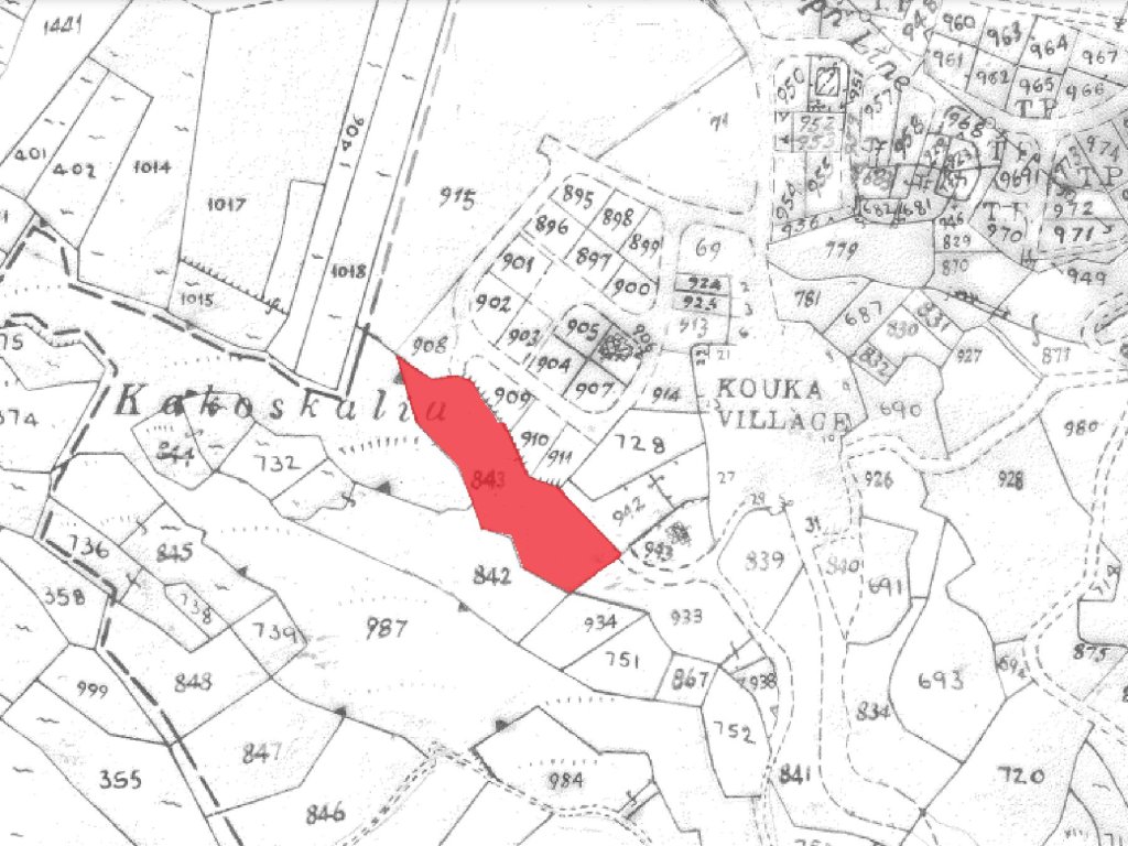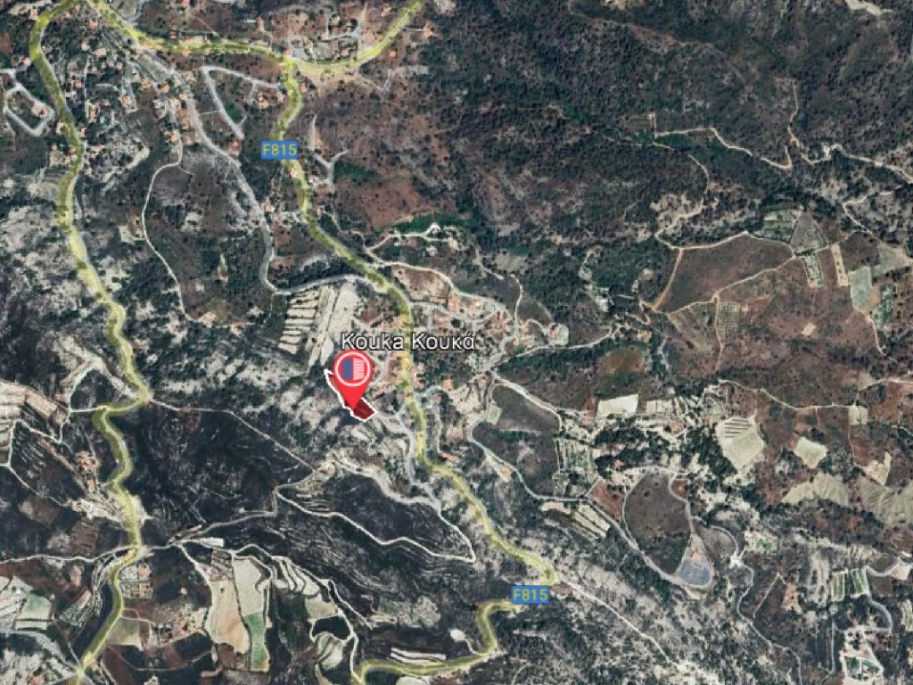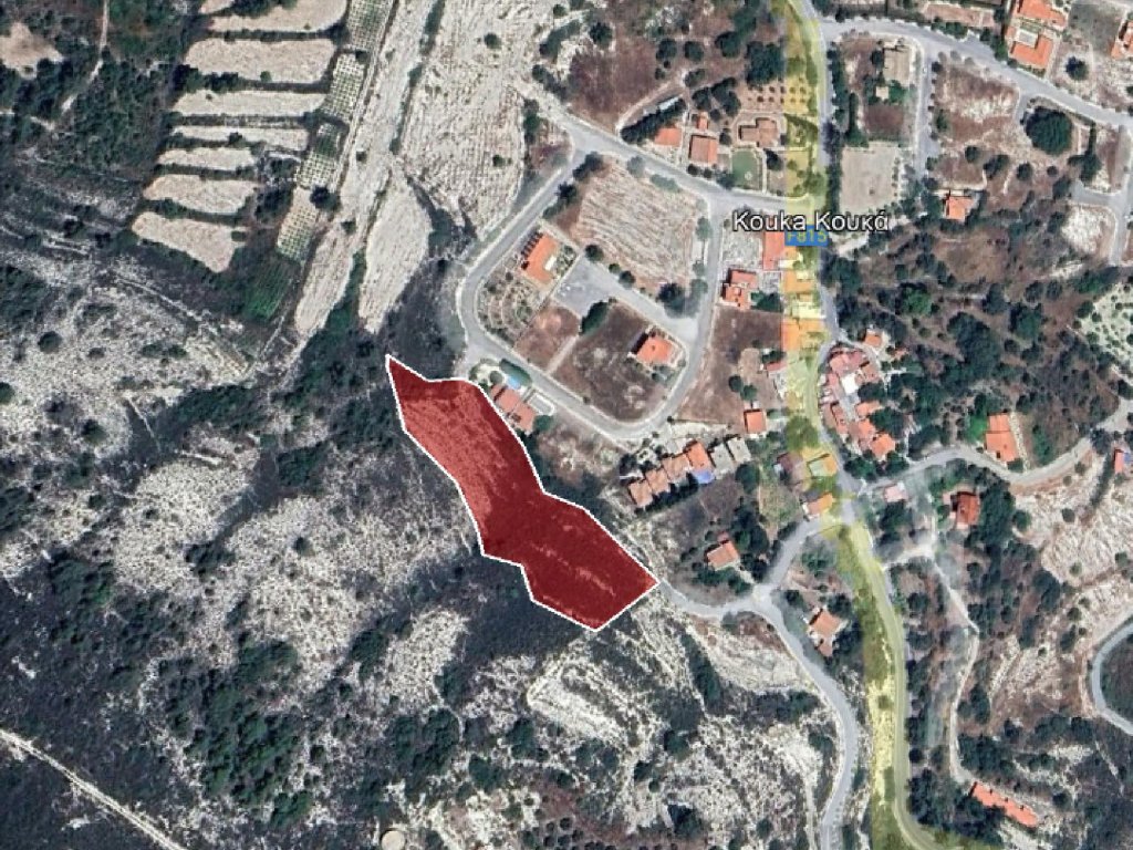 Residential field in a quiet and purely residential area in Kouka village in the District of Limassol.It is situated at a distance of approximately 150 meters southwest from the village centre and approximately 100 meters west of the main road connecting the villages of Kouka and Pera Pedi.The property has irregular shape and sloping towards the northeast.It abuts to point onto a public registered road along its southeastern and northeastern boundary with frontage of approximately 10 meters.The locality of the property is characterized by a beautiful natural environment.