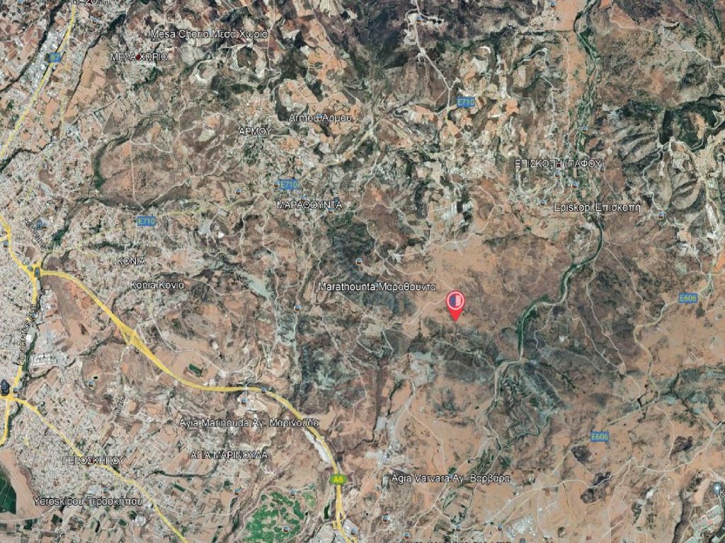 Available for sale is the 6/7 undivided share of an agricultural field, which corresponds to an area of approximately 2,007 sq.m, in Marathounta community, in Paphos District. It is situated 2.6 kilometers (approx.) southeast ― from the centre of the community and 2.5 kilometers (approx.) northeast of the Paphos - Limassol motorway.It has an irregular shape and an unevensloping surface. The property can be accessed via a right of way.The property is located at the vicinity of high voltage electric towers.It is set in a tranquil, beautiful natural environment.