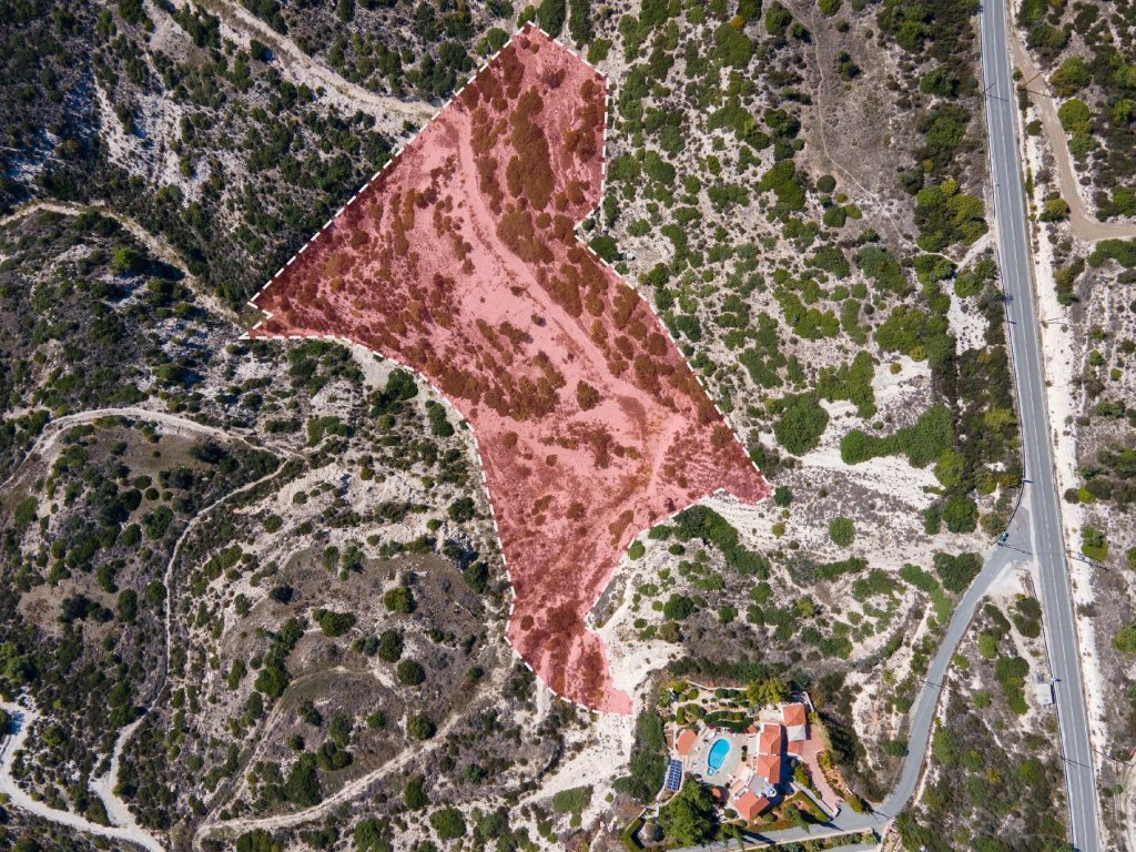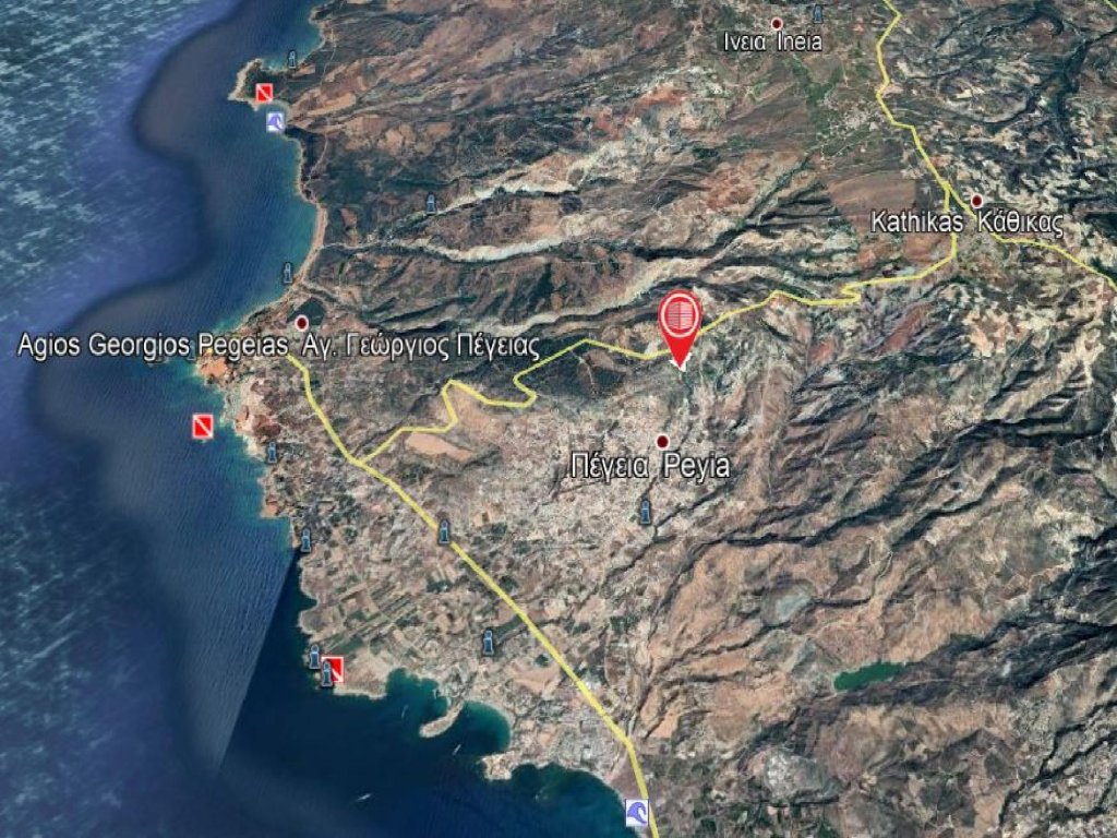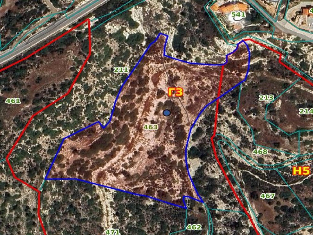 Residential field in Pegeia Municipality, in Paphos District.It is situated at a distance of approximately 1,3 km north from the municipality centerand approximately 60 meters east of the main road Pegeia - Kathikas.It has a rectangular shape, a slopingsurface andabuts onto a public registered road along its northeastern boundary with a frontage of approximately 7 meters. It falls within the Residential Zone H5 (6%) and within the Agricultural Zone Γ3 (94%).The property has very good access to the Municipality center and to the neighboring communities.