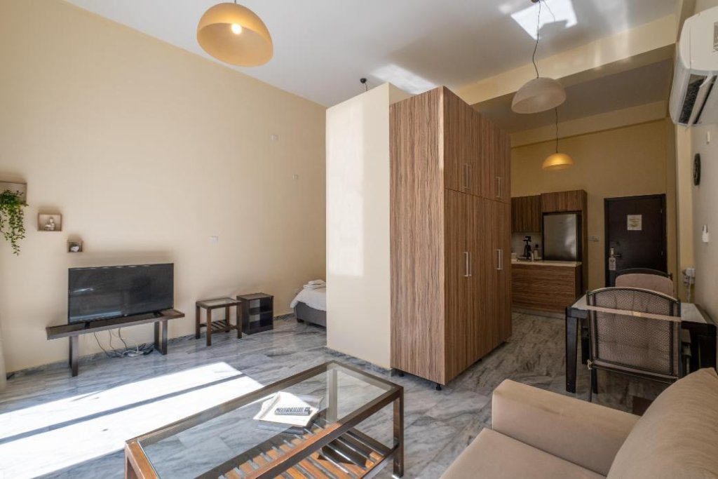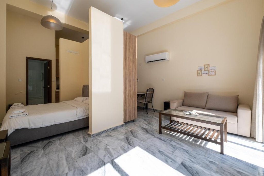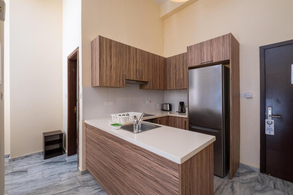 The studio has a covered area of 48sqm and uncovered verandas of 22sqm. It is situated on the ground floor of Block C. It consists of an open plan area with kitchenette, sitting area, a double bed, a bathroom with toilet and a private swimming pool.